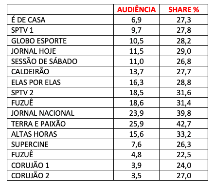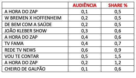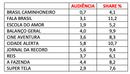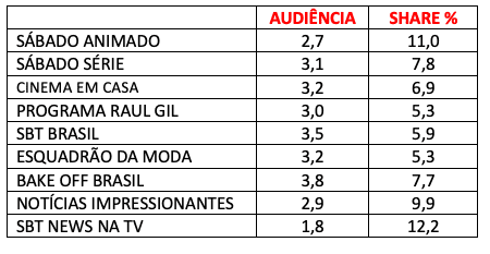 Confira abaixo as médias e o share dos programas exibidos no sábado, dia 07 de outubro de 2023: