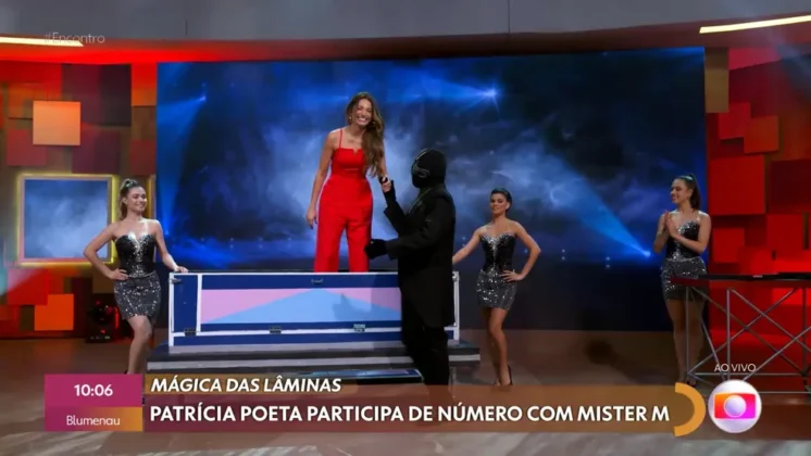 Patrícia Poeta topou o desafio. Assim, em uma caixa, com quatro lâminas de aço, a apresentadora ficou com apenas uma das mãos a vista. Ao final veio a revelação do truque.