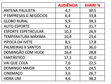 O Pipoca da Ivete voltou a sofrer com a concorrência. O programa comandado por Ivete Sangalo marcou apenas 8,5 de média e 17,8% de share. Nesta faixa, o SBT chegou a 8,2 pontos e o streaming conseguiu ultrapassar os 11 pontos. São índices baixos que colocam a Globo num patamar muito baixo e que prejudica toda a estratégia da programação da tarde. O jogo Palmeiras X Santos marcou 19,5 de média. Um crescimento de 11 pontos, o que só evidencia o quanto baixo estava o Pipoca da Ivete. O Domingão com Huck fechou com 16,4 de média e teve seu pico durante Batalha do Lip Sync.
