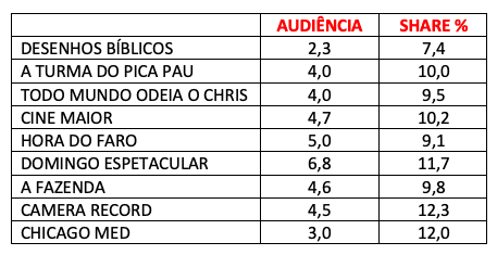 No SBT, o Domingo Legal fechou com 6,6 pontos, Eliana fechou com 6,7 de média e o Programa Silvio Santos com 6,7 pontos. Na Record, Hora do Faro marcou com 5,0 de média e o Domingo Espetacular com 6,8 pontos.