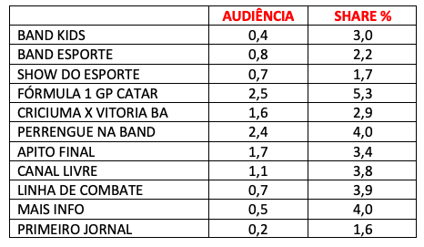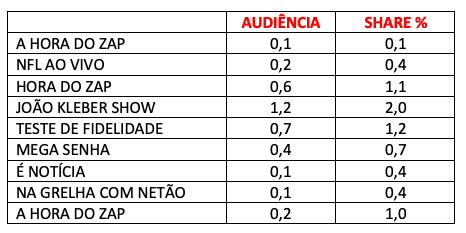 Confira abaixo as médias e o share dos programas exibidos no domingo, dia 08 de outubro de 2023: