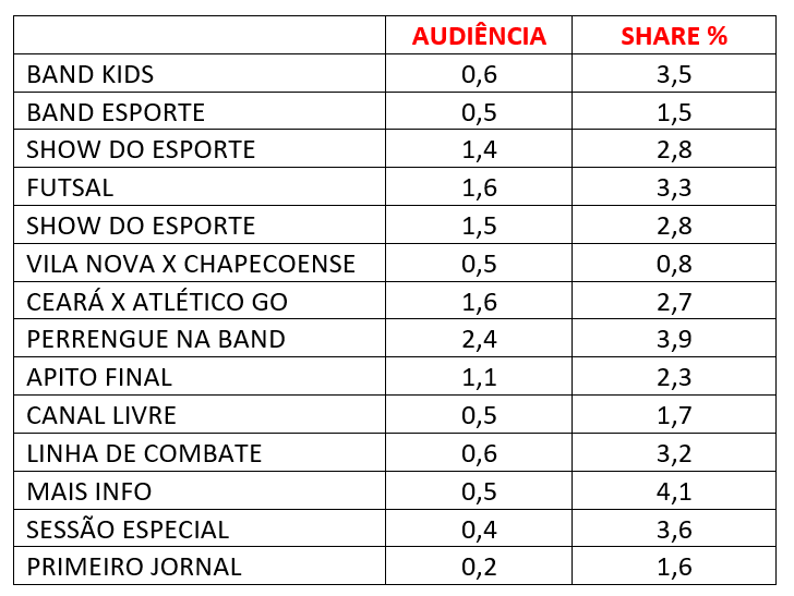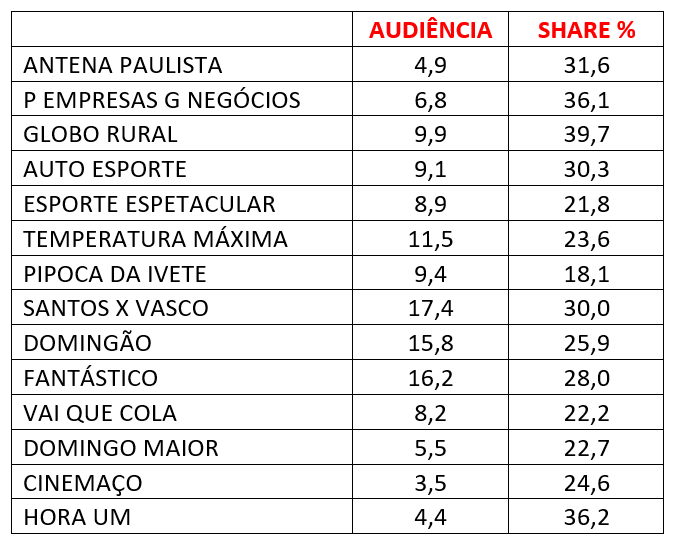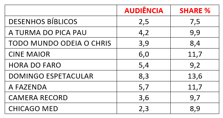 Confira abaixo as médias e o share dos programas exibidos no domingo, dia 24 de setembro de 2023: