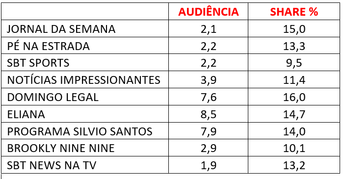 O SBT comemorou os resultados deste domingo. Celso Portiolli ultrapassou o Pipoca da Ivete e fechou com 7,6 pontos e 16% de share. É um ponto acima do que foi registrado na semana passada. Na sequência, Eliana marcou 8,5 de média e 14,7% de share. O Programa Silvio Santos também fechou na vice-liderança. Os resultados foram alcançados num domingo em que o futebol não contribuiu para chamar público para a Globo, mesmo que tenha feito o milagre de ter tirado a emissora os 9,4 pontos do Pipoca da Ivete para 17,4 pontos n partida entre Santos e Vasco. O aumento de oito pontos não fez o mesmo efeito da semana passada.