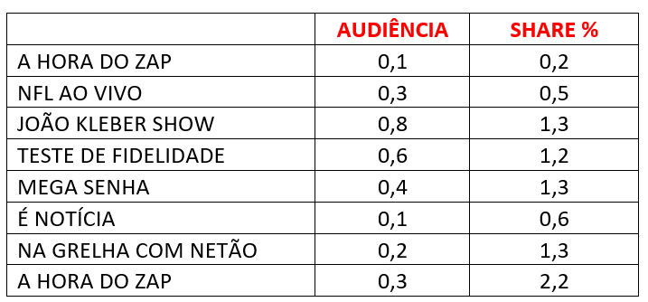 Na Record, a repercussão da eliminação de A Fazenda contribuiu para a média do Hora do Faro. O programa fechou com 5,4 pontos e 9,2% de share.