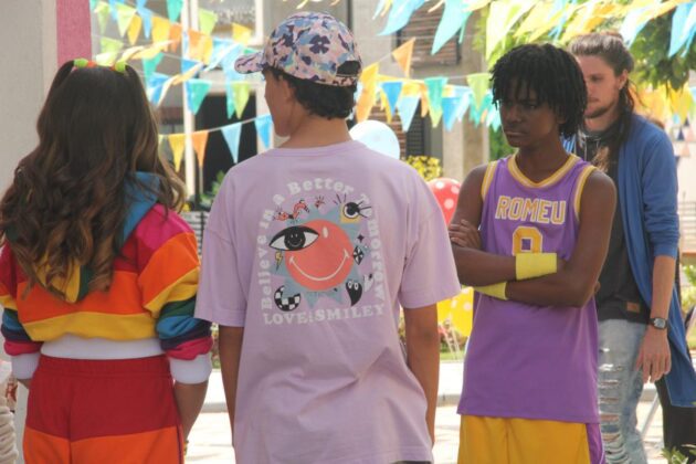 Fora do palco, Téo resolve ajudar e apoiar Lívia. Após ver Lívia feliz, Téo diz que ficou chateado com o término, mas que deseja continuar a amizade. Disfarçado, Fred se apresenta cantando no evento; Vera, Bernardo e Glaucia o reconhecem. Na coxia, Glaucia surta com o marido pela exposição e diz que Leandro não gosta dessa atitude. Julieta e Téo querem Diego no time deles no “Jogo da Bandeira”, mas Diego explica que prefere ficar longe deles por conta do ciúme de Patrick. Julieta e Téo aconselham Patrick a pedir desculpa a Diego. Pedalzera também se apresenta no show de talentos. No baile da festa, Telma convida Mauro para dançar e Daniel chama Mariana. Diego dança com Julieta; Romeu nota a cena e convida Karen. Lívia dança com Alex, o que deixa Patrick irritado, mas Téo explica que ela é livre para dançar com quem quiser. Karen e Romeu trombam em Julieta e Diego. O júri escolhe os vencedores do show de talentos e anunciam os três colocados; o grande campeão ganha uma bicicleta. O “Jogo da Bandeira” se inicia e Lado Torre e Lado Vila se enfrentam em quadra.