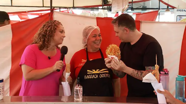 E por fim, ainda visitaram a Barraca Oriental para experimentar o tempurá, o camarão e os espetinhos. E entrevistam Sueli, para saber a história da barraca que está na feira desde 1975.