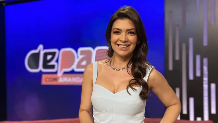 No palco da TV Aparecida, Amanda Françozo comanda seu programa com muitas informações interessantes ao telespectador