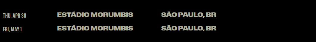 Por fim, depois do Rio, a turnê segue para São Paulo, com shows no Morumbi nos dias 30 de abril e 1º de maio.